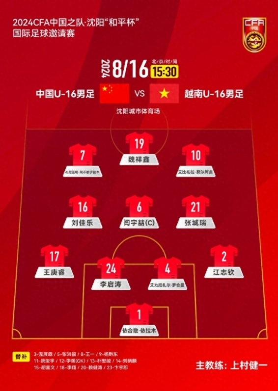在下午3时30分,中国U-16国家队将迎来与越南U-16国家队的邀请赛对决。在赛事启幕之前,双方参赛阵容已正式揭晓。